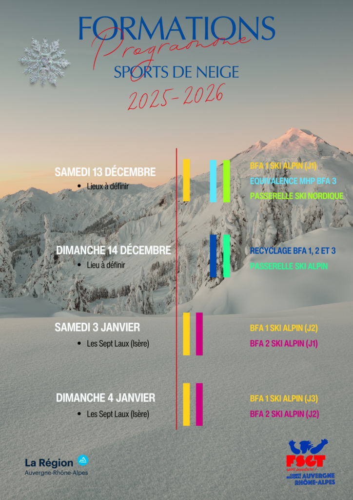 - 13 décembre 2025 lieu à définir et 3, 4 janvier 2026 aux 7 Laux (38) BFA Moniteur 1er degré