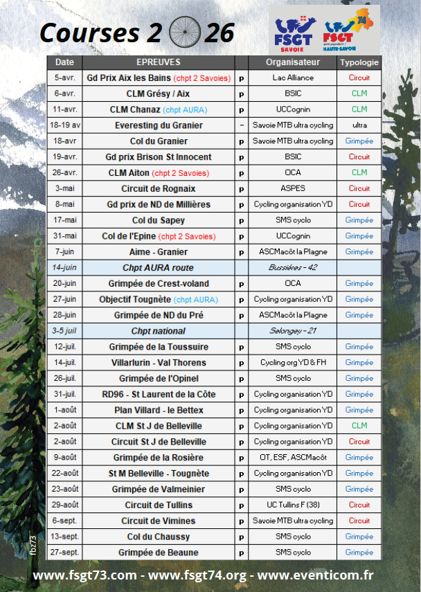 Un calendrier de plus de 25 épreuves FSGT de mars à octobre en Savoie et Haute-Savoie.