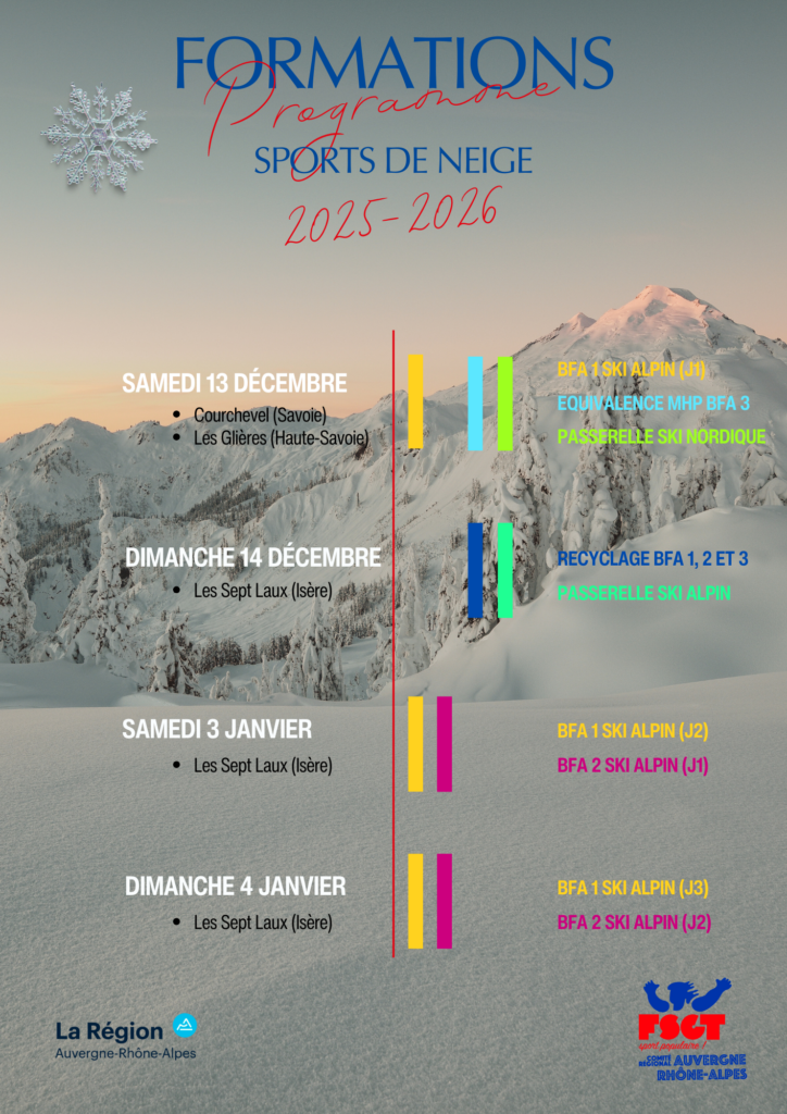 - 13 décembre 2025 lieu à définir et 3, 4 janvier 2026 aux 7 Laux (38) BFA Moniteur 1er degré