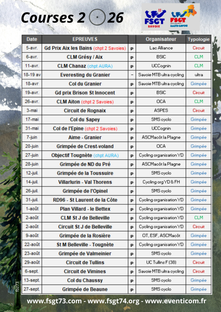 Un calendrier de plus de 25 épreuves FSGT de mars à octobre en Savoie et Haute-Savoie.