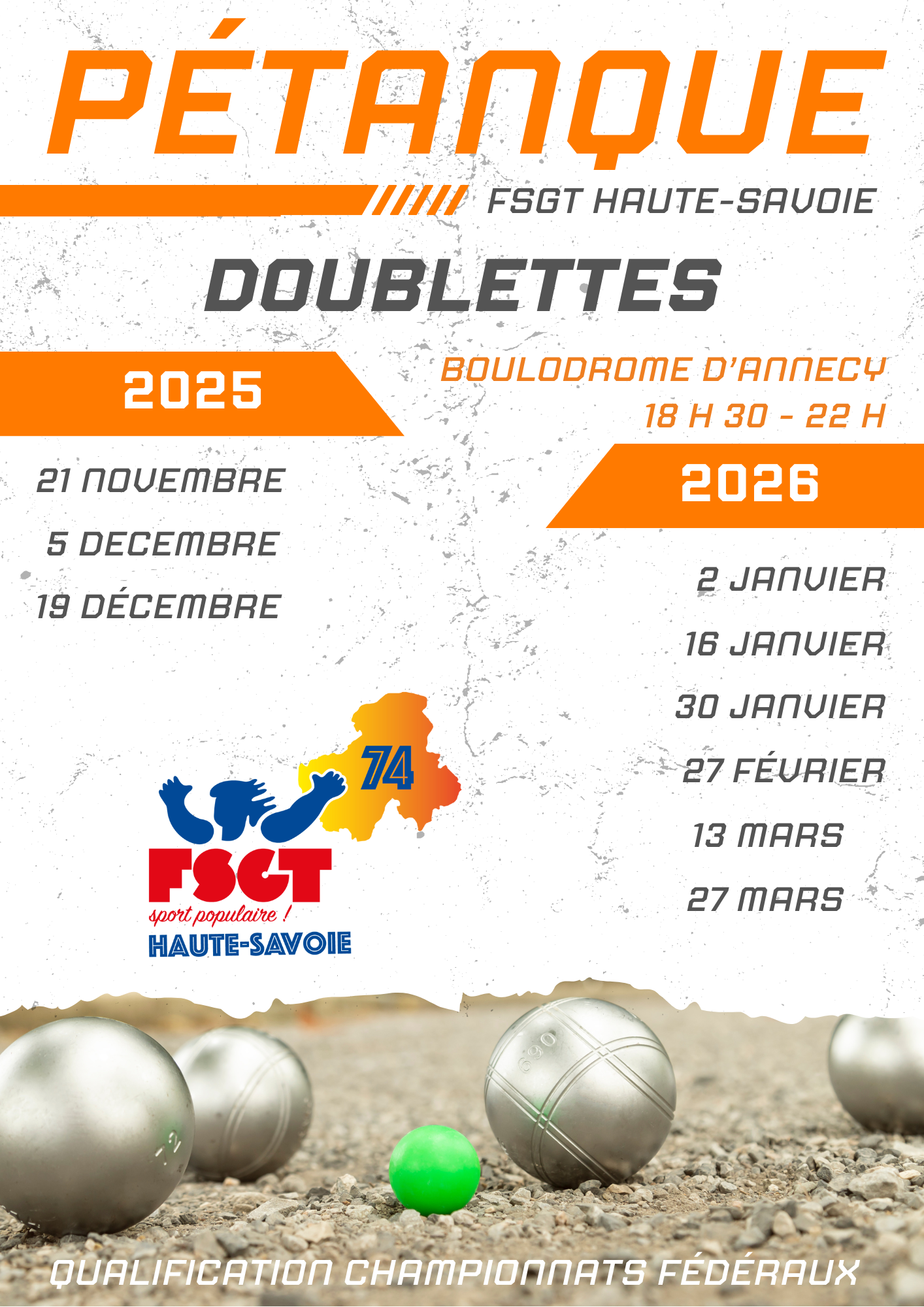 Championnat d’hiver au Boulodrome d’Annecy (34 boulevard du Fier) à partir de la mi-novembre, jusqu’en avril.